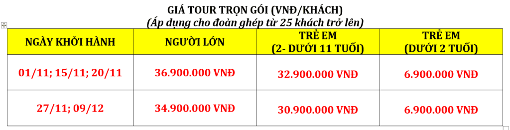 Khởi hành: 01/11; 15/11; 20/11; 27/11; 09/12