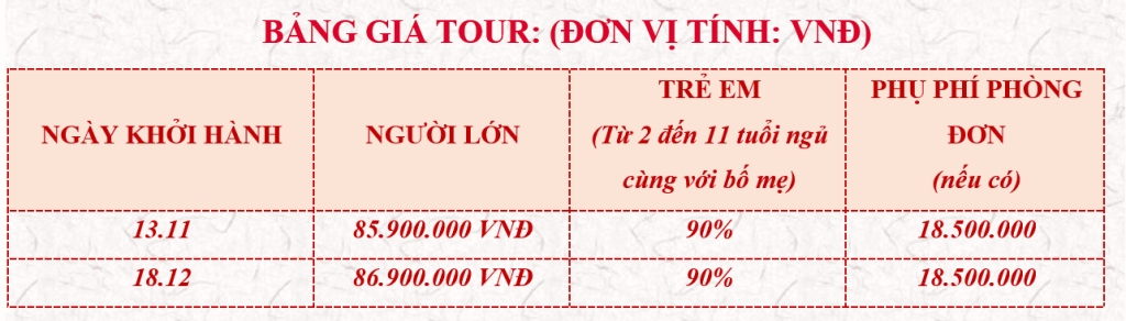 • TIP cho HDV và lái xe địa phương: 88 Euro/khách