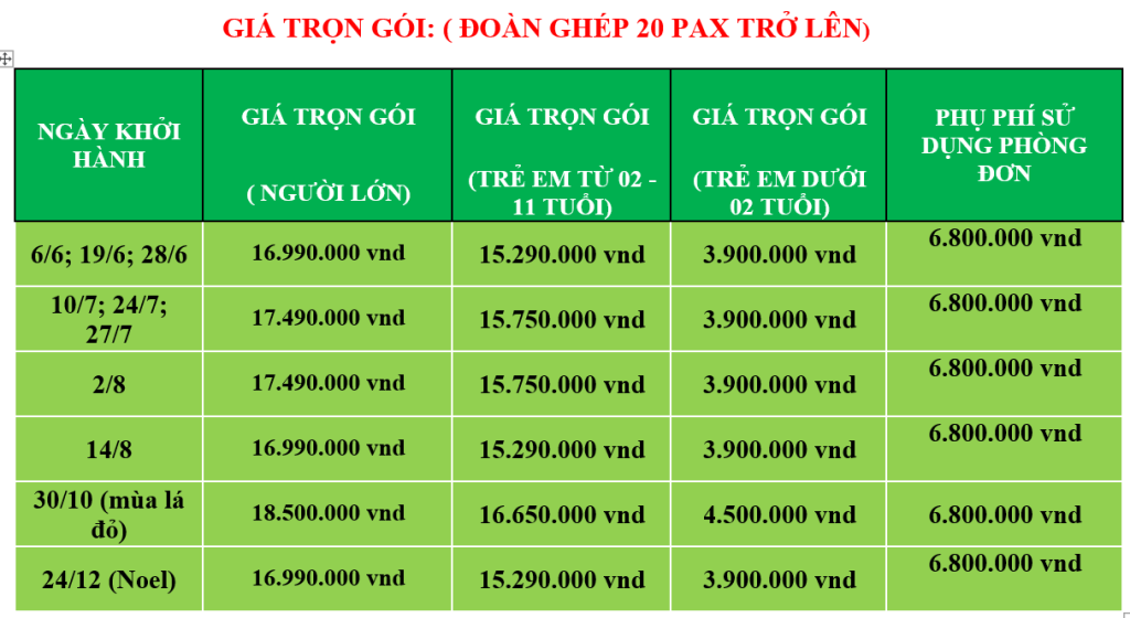 • Giá tour có thể thay đổi khi hàng không tăng phụ thu nhiên liệu và phí visa thay đổi,